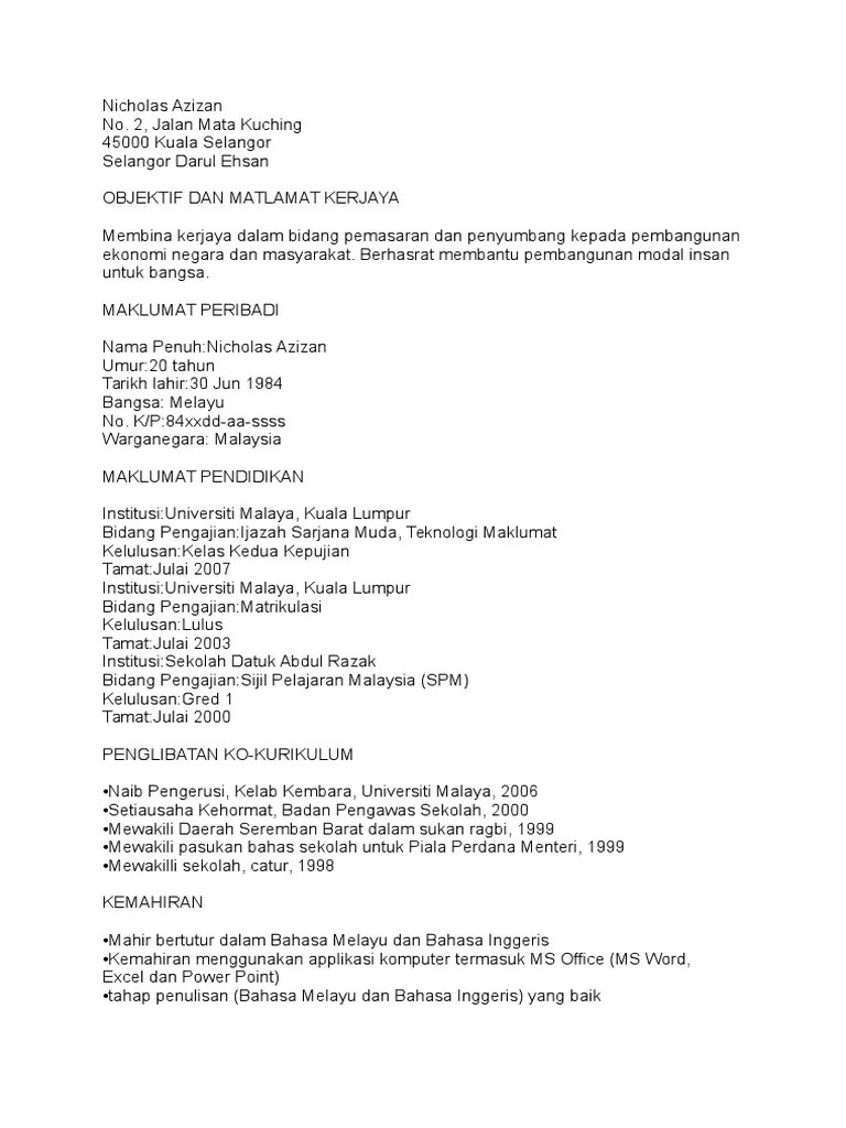 • gunakan perkataan yang ringkas dan. Apr 26, 2022 · anda tidak senarai skill (kemahiran) yang anda miliki untuk ditawarkan di tempat kerj abaru anda; No tel rumah & tel … Semoga anda dapat kerja yang baik dan sesuai dengan kelulusan anda kongsikan di facebook, telegram & group whatapps kawan2 dan family anda! Download 5 template premium contoh resume bahasa melayu edisi 2022 ini dan diedit dalam ms word. 87% 87% menganggap dokumen ini bermanfaat,. Oct 06, 2021 · • elakkan daripada mengulangi maklumat yang sedia ada dalam resume. • anda tidak perlu membincangkan hal gaji dalam cover letter. Kemahiran menggunakan applikasi komputer termasuk ms office (ms word, excel dan power point) tahap penulisan (bahasa melayu dan bahasa inggeris) yang baik; Baca versi flipbook dari buku teks bahasa melayu tingkatan 1. Masukkan maklumat diri yang berkenaan dan bersesuaian dengan kerja yang akan anda pohon seperti pengalaman kerja dan. Bahasa melayu ialah mata pelajaran teras dalam kssr yang wajib dipelajari oleh semua murid tahap 1 dan 2dari tahun 1 hingga tahun 6. Simpan simpan contoh resume bahasa melayu untuk nanti.